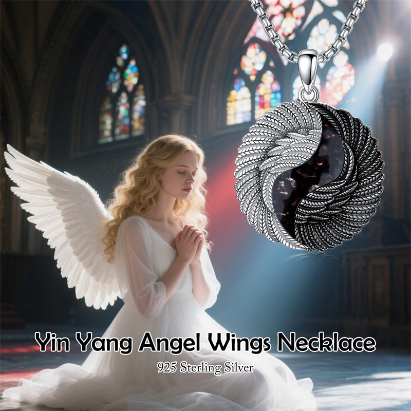 ANGEL WINGS: Angel wings symbolize a connection to the divine, offering protection, guidance, and spiritual comfort. Wearing a yin-yang necklace can help cultivate peace, attract positive energy, and encourage equilibrium in one's life. Inlaid with stone fragments of obsidian, this angel wings necklace can be a powerful protection necklace for you!