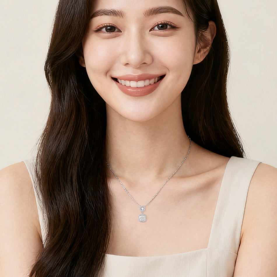 This exquisite Moissanite pendant necklace showcases a stunning double-drop design featuring a round brilliant-cut Moissanite encircled by a halo of smaller gemstones, suspended above a larger square-cut Moissanite with its own radiant halo. Crafted in polished silver, the intricate setting enhances the Moissanites' brilliance, while the delicate chain adds a touch of sophistication. Perfect for formal events or everyday wear, this piece combines classic elegance with modern sophistication, making it a versatile addition to any jewelry collection. Whether gifted or self-purchased, this luxurious necklace symbolizes timeless beauty and refined taste. Its meticulous craftsmanship ensures durability and shine, elevating any outfit with effortless glamour. A true statement of luxury, it captures light from every angle, creating a dazzling effect that embodies eternal elegance. Ideal for anniversaries, engagements, or special celebrations, this pendant is more than jewelry—it’s a heirloom worthy of cherished moments.