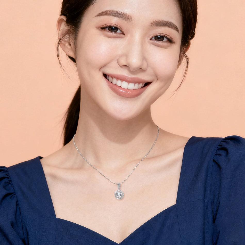 This exquisite Moissanite pendant necklace showcases a stunning round centerpiece encircled by a radiant halo of smaller gemstones, suspended from a delicate teardrop-shaped bail adorned with three additional Moissanites. Crafted in polished sterling silver, the intricate design combines timeless elegance with modern sophistication, perfect for elevating any ensemble. The adjustable chain ensures a customized fit, while the precision-cut Moissanites catch light effortlessly, creating a mesmerizing display of brilliance. Ideal for special occasions or everyday wear, this piece symbolizes enduring beauty and makes a meaningful gift for loved ones. With its balanced proportions and high-quality materials, it promises lasting allure and versatility, complementing both formal attire and casual styles.