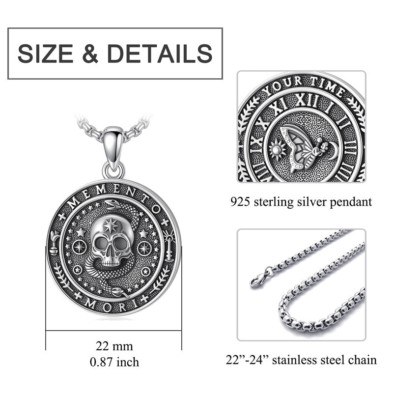 A: Memento mori is a Latin phrase meaning "remember you must die". The memento mori necklace is accompanied by a skull and an hourglass, reminding us of the brevity of life and the inevitability of death, letting us realize the meaning of life, and encouraging us to live in the present and value every moment.