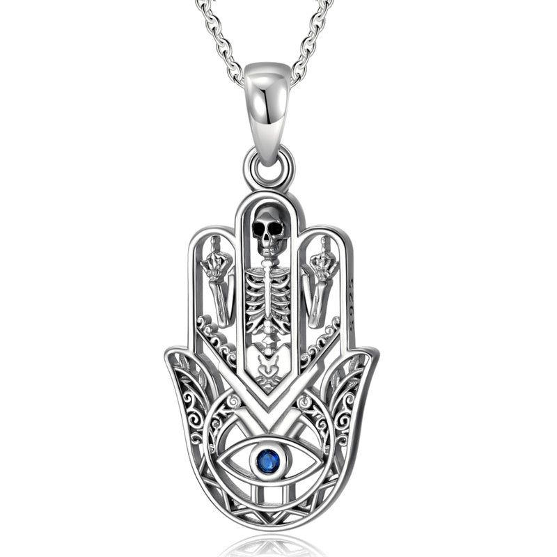 Skull Hamsa Necklace: The skull symbolises death, rebirth, and change, while the hamsa hand is a sign of protection, also named the hand of Fatima, representing blessings, auspiciousness, and blessings, and the evil eye design could keep bad luck away from you and bring good luck.