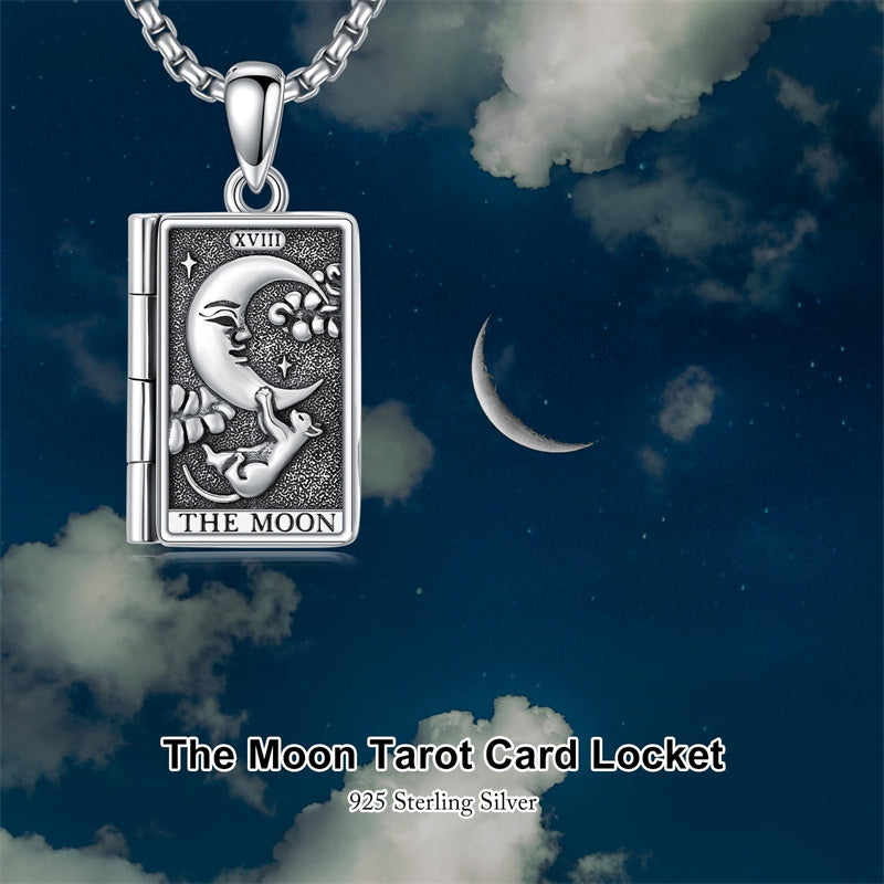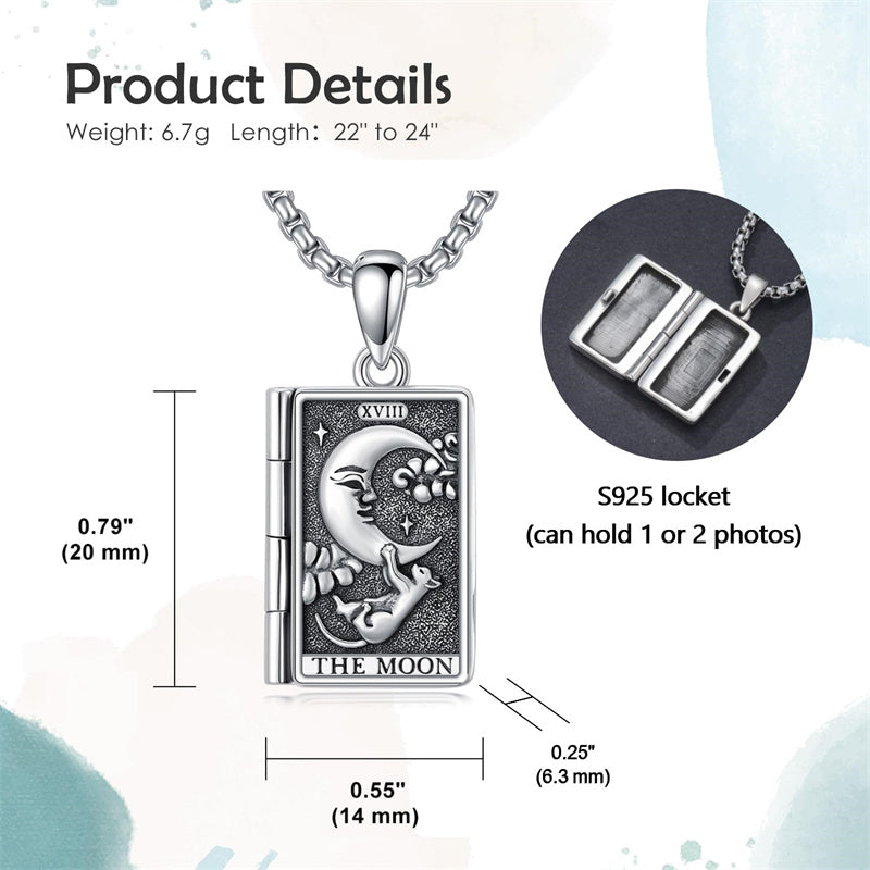 Moon :The Moon Tarot card represents unconscious, insightful visions, and strong intuition. Featuring a naughty cat hanging on the moon, this Moon Tarot card necklace is chic and unique. With a locket pendant, this locket necklace can be unique personalized picture gifts for you! Surprise you love with this moon necklace!