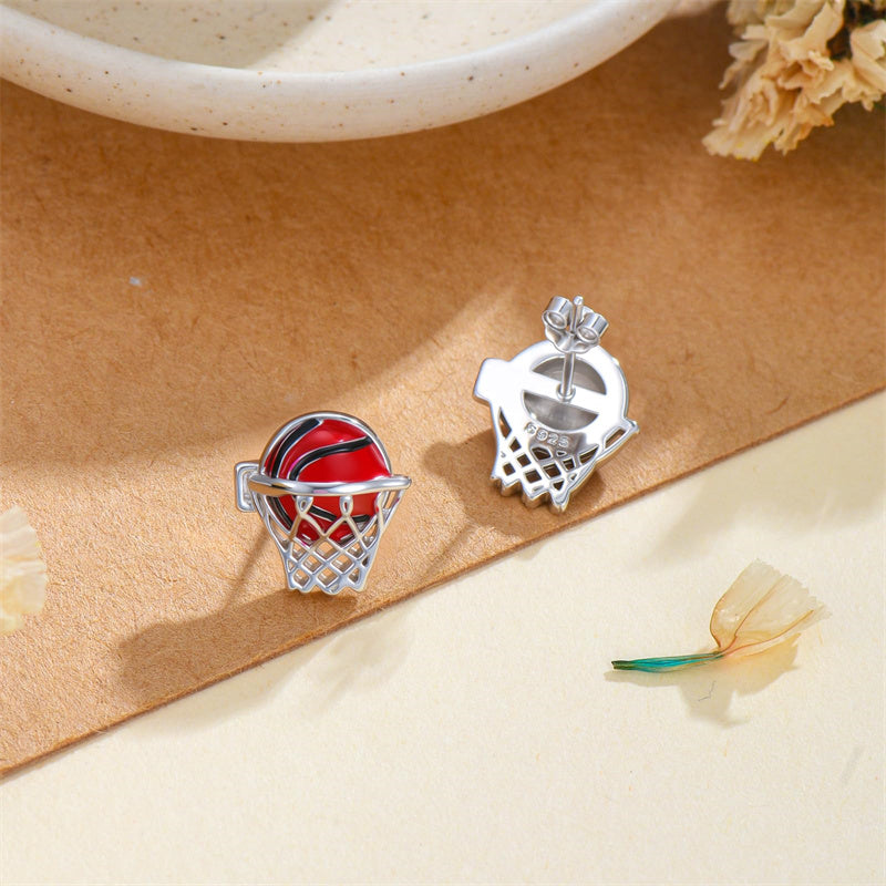 Basketball: These basketball earrings are designed for basketball enthusiasts. Crafted with a drip-gum technique, the earrings feature vivid details and feature the basketball hoop and basketball motif. Show off your love for the sport with these basketball stud earrings.
