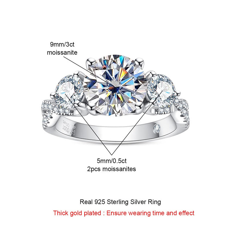 CLASSIC DESIGN: Classic minimalist ring design, 3.0ct D color center moissanite engagement Ring and 2*0.5ct moissanite stone , excellent eight hearts and arrows, round brilliant cut is the best shape to reflect lights in and out. Timeless classical in beauty boost any casual or elegant formal attire, making you focus of the feast, banquet, meeting, dating, prom, party, travel, just feel confident to wear it, be ready for receive many compliments from your friends.