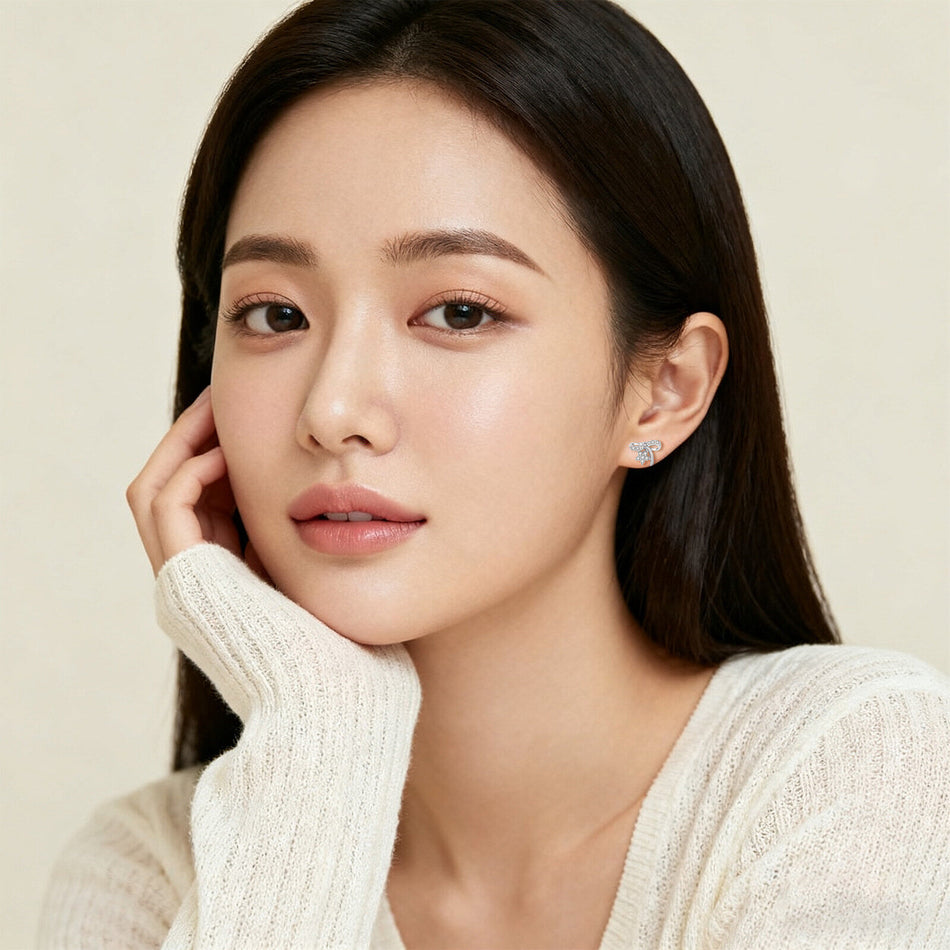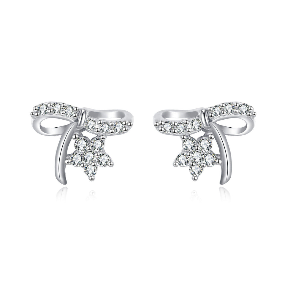 These exquisite stud earrings feature intricate silver bows adorned with sparkling Zircon-like stones, complemented by delicate floral motifs below. Crafted with precision, the metallic sheen of the bows contrasts beautifully against the deep blue velvet backdrop, highlighting their luxurious appeal. The design combines classic elegance with modern sophistication, making them perfect for formal occasions or as a timeless gift. Each earring measures approximately 1 cm in width, ensuring subtle yet striking presence when worn. The craftsmanship showcases attention to detail, from the symmetrical arrangement of gemstones to the polished finish of the metal. Whether paired with evening wear or dressed up for special events, these earrings exude refined charm. Their compact size and secure post backing offer comfort and versatility, while the vibrant blue display enhances their visual impact. A ideal choice for those who appreciate understated luxury and artistic jewelry design.
