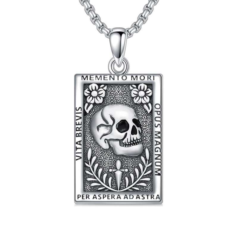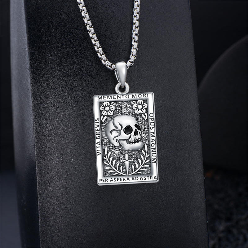 Memento mori is a Latin phrase meaning "remember that you must die". Engraved with "VITA BREVIS OPUS MAGNUM PER ASPERA AD ASTRA", meaning "Life is short, great work through the rough to the stars", this memento mori necklace reminds us that life is short and we should love life and cherish every moment. Surprise your loved one with this Stoic necklace!