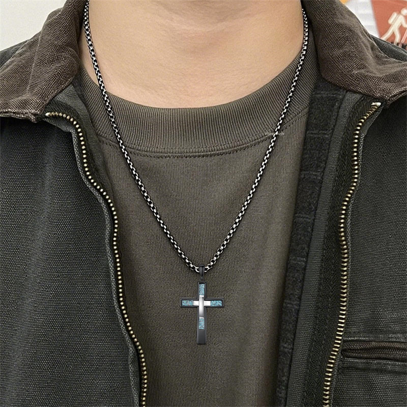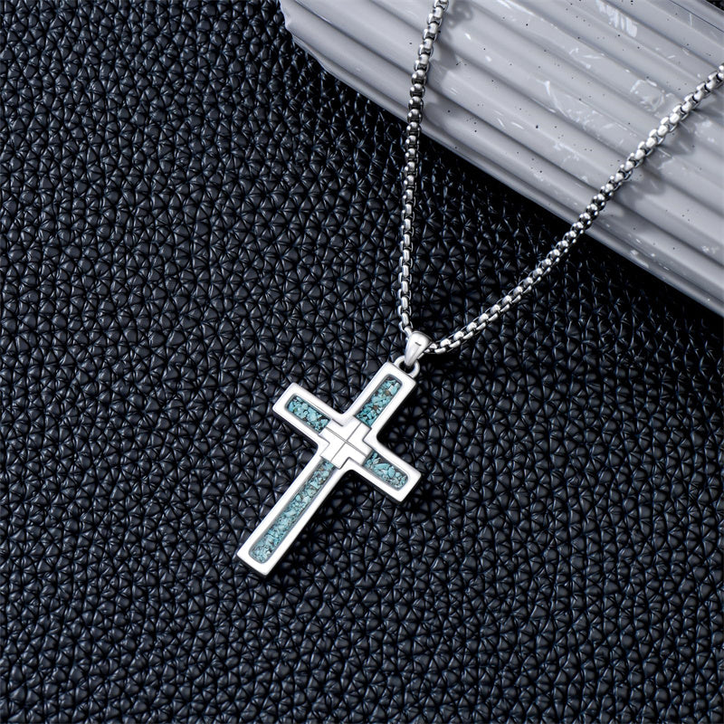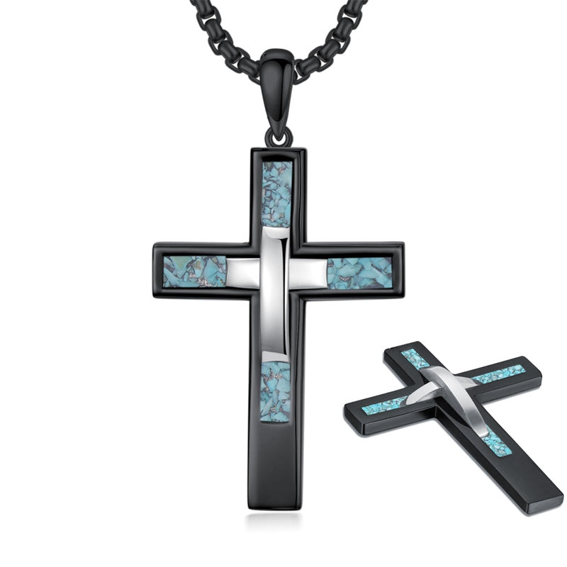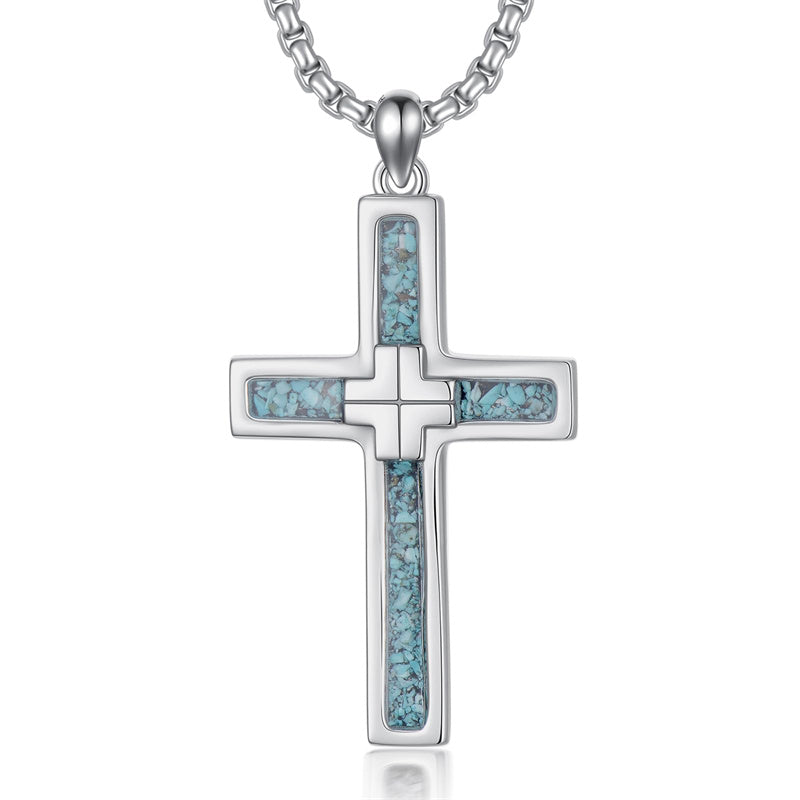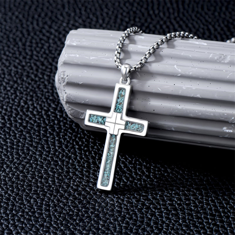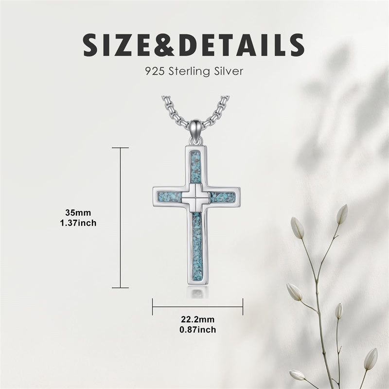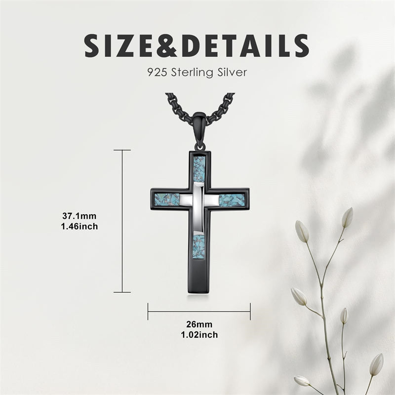 D: This turquoise cross necklace is a perfect blend of faith and art. The cross is studded with turquoise fragments, symbolizing spiritual tranquility. Its two-tone design combines classic religious symbolism with a unique texture. The raised design in the middle of the cross is even more unique. This meaningful piece is made for those who desire to wear the beauty of faith, combining tradition and nature.