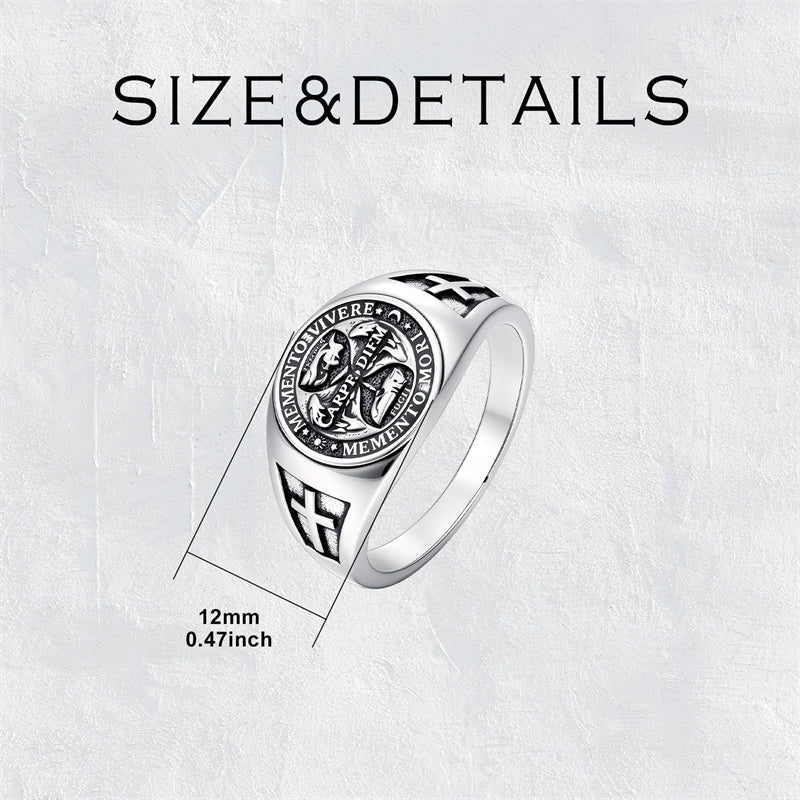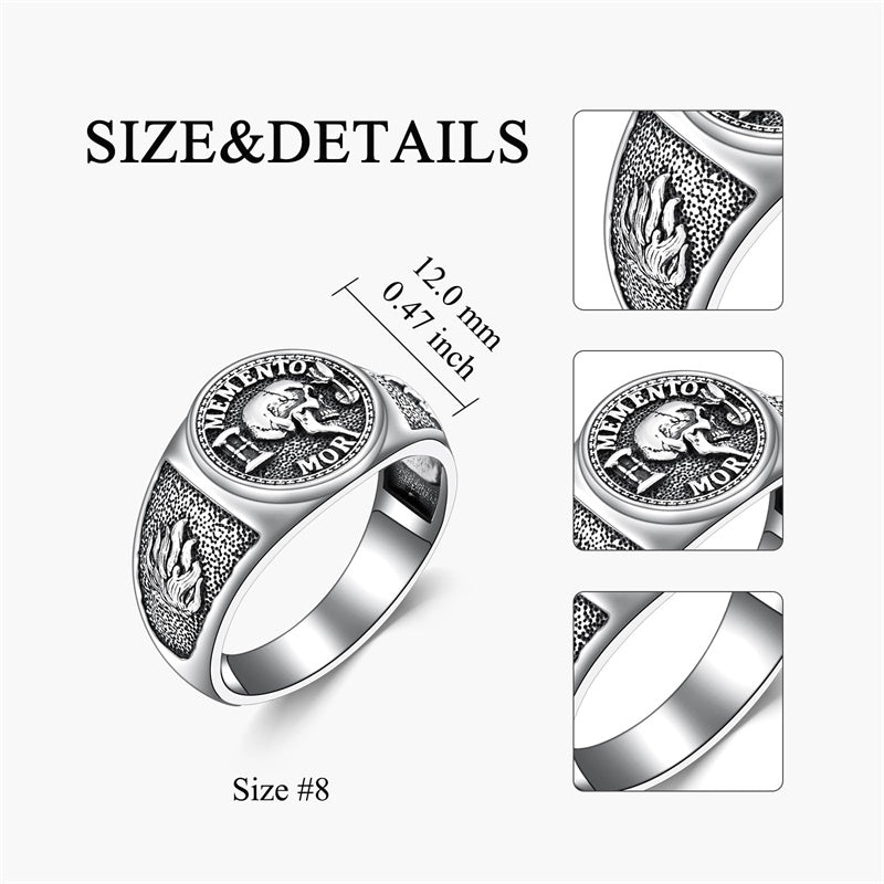 MEMENTO MORI means "Remember you will die." Let this ring remind you to live every day to its fullest potential, for we are not promised tomorrow - just as the phrase conveys, death is inevitable. This is not a morbid message, but instead a positive reminder to make the most of every moment you are given, to recognize the opportunity in every day we wake up and keep breathing.