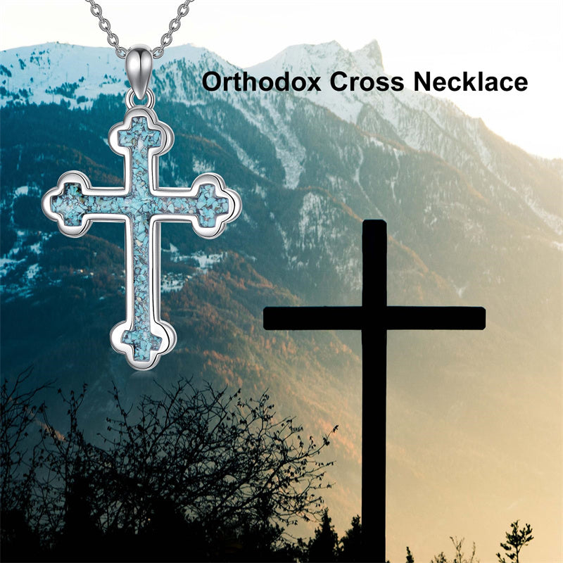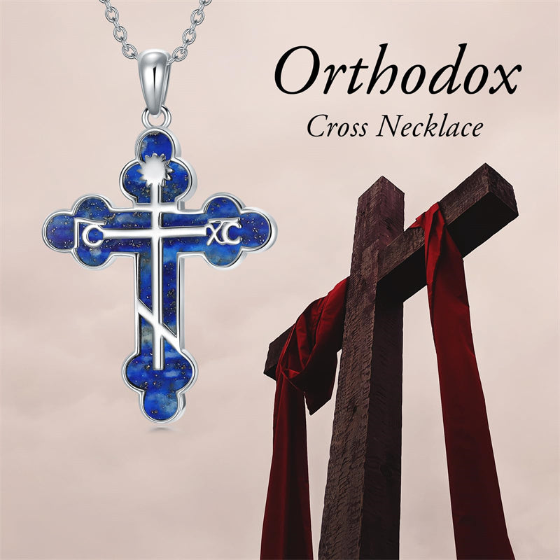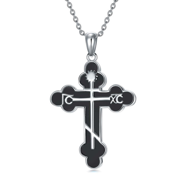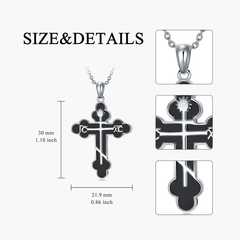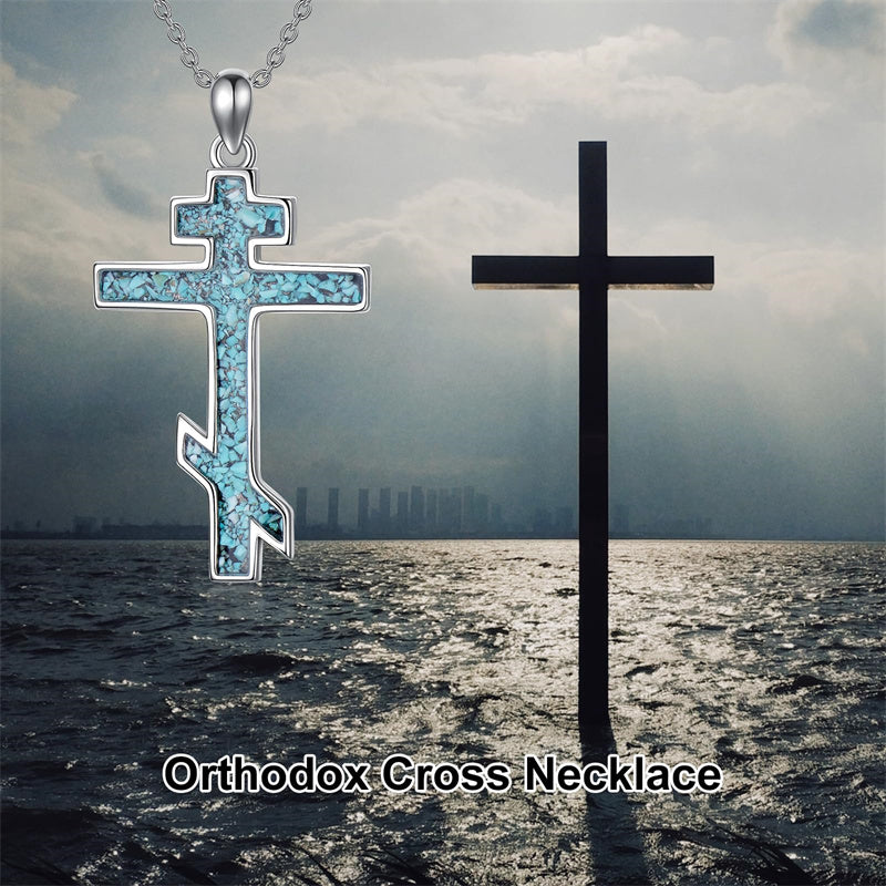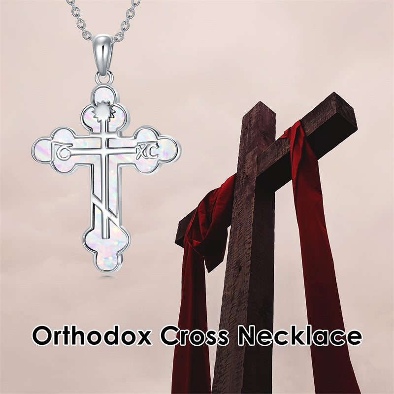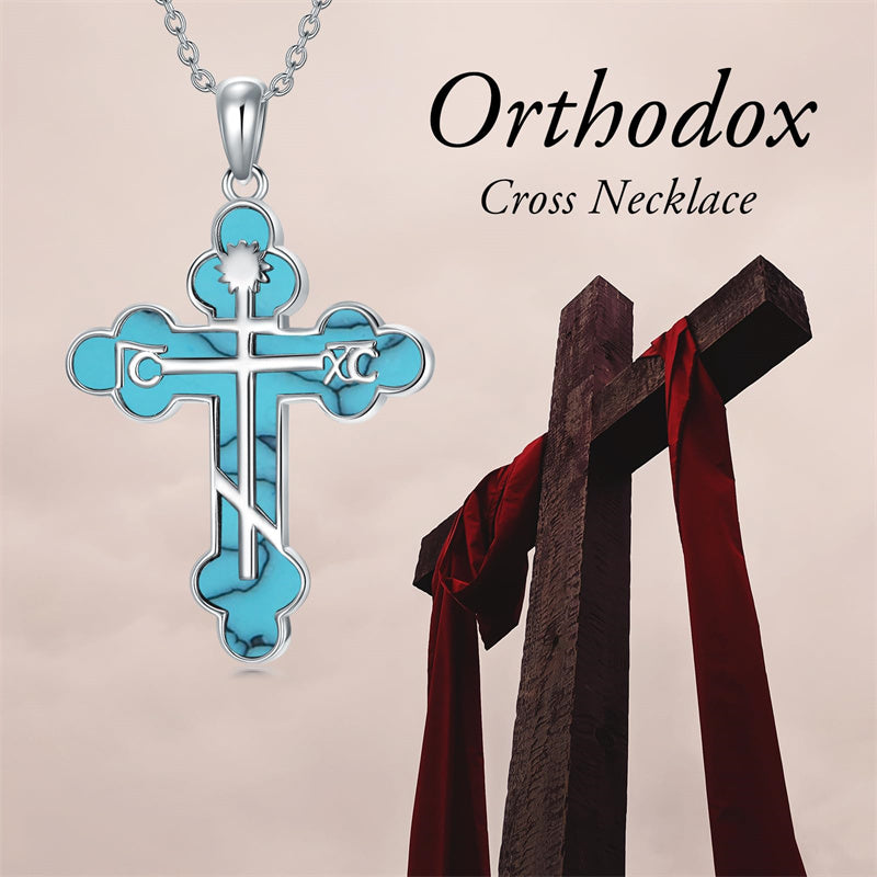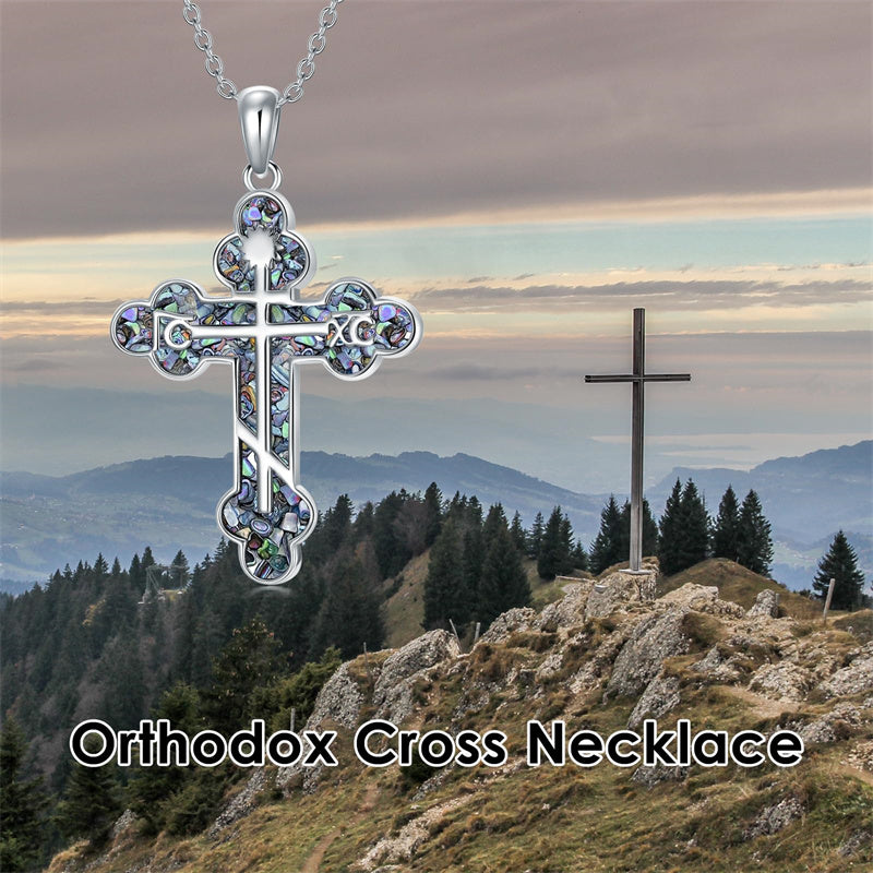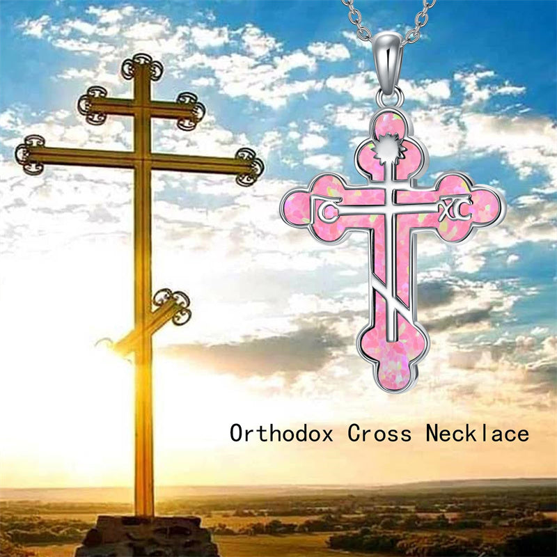 The pendant is a classic Orthodox cross design, typically featuring a cross with three horizontal beams representing the Holy Trinity. The arms of the cross are usually slightly slanted, with the lower beam longer than the others.