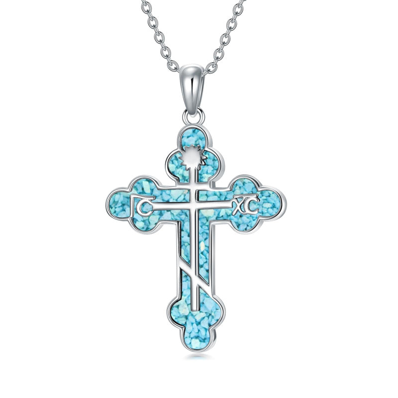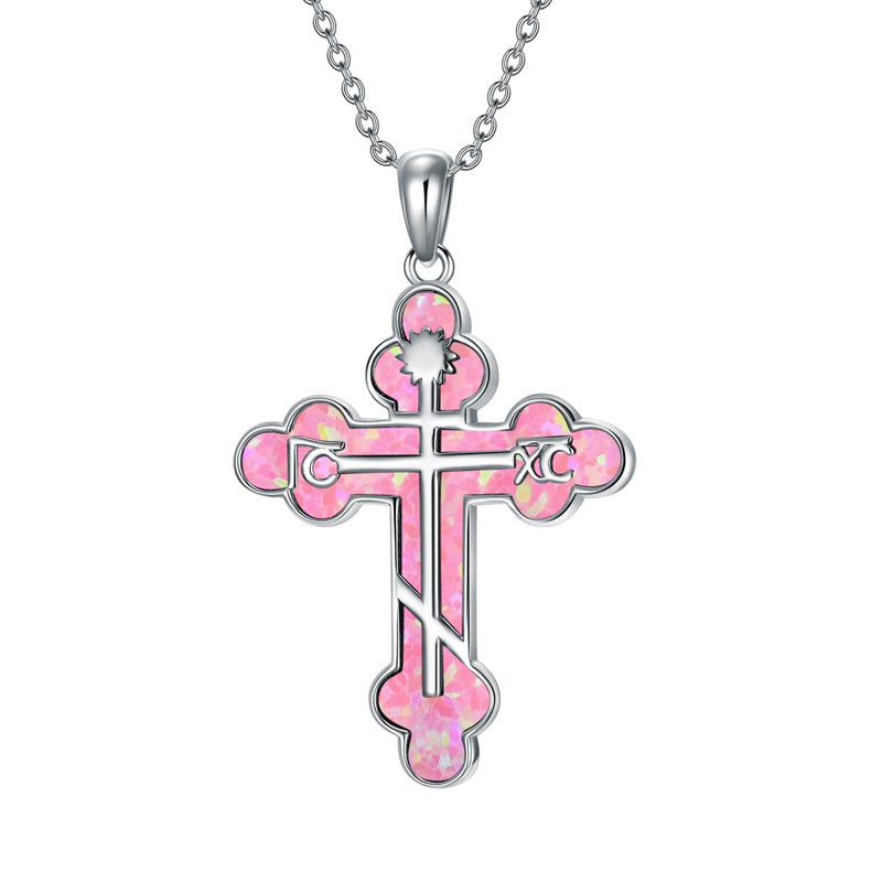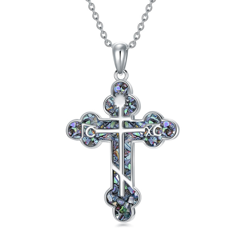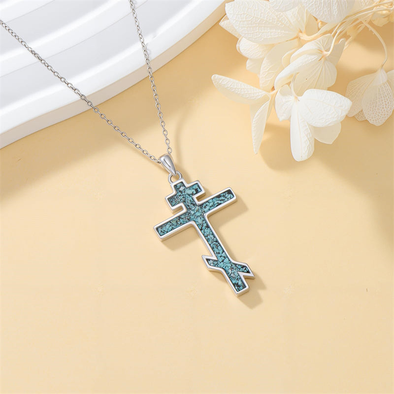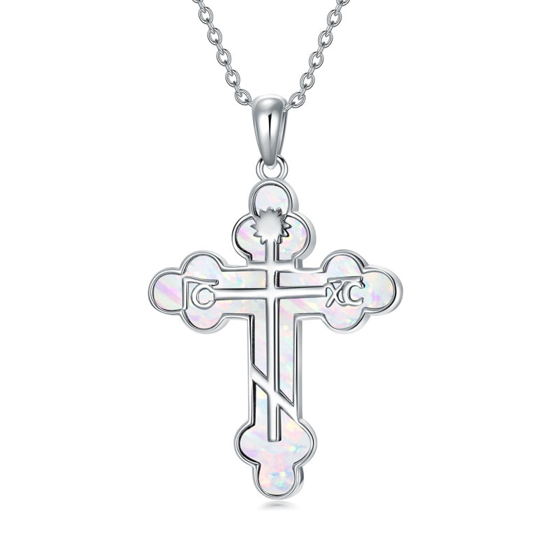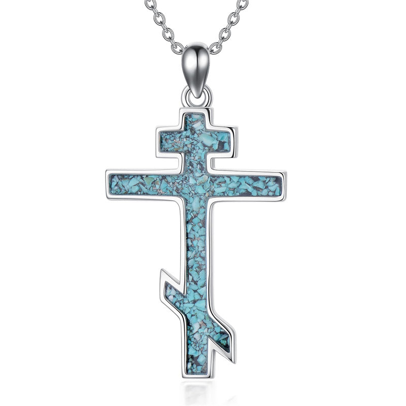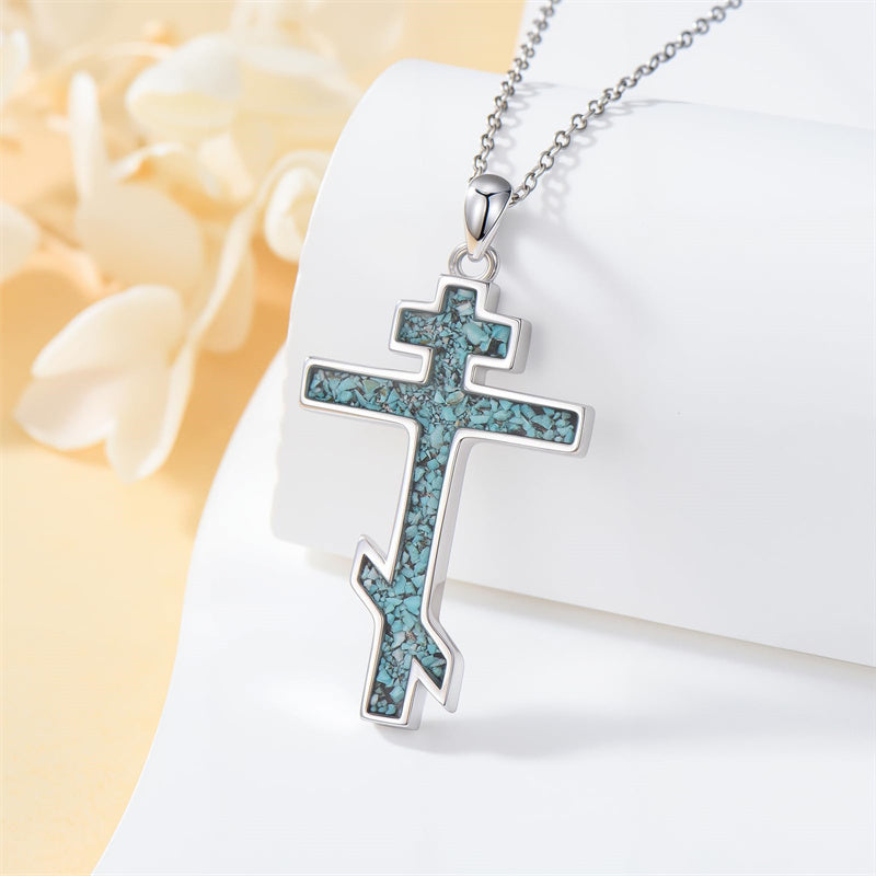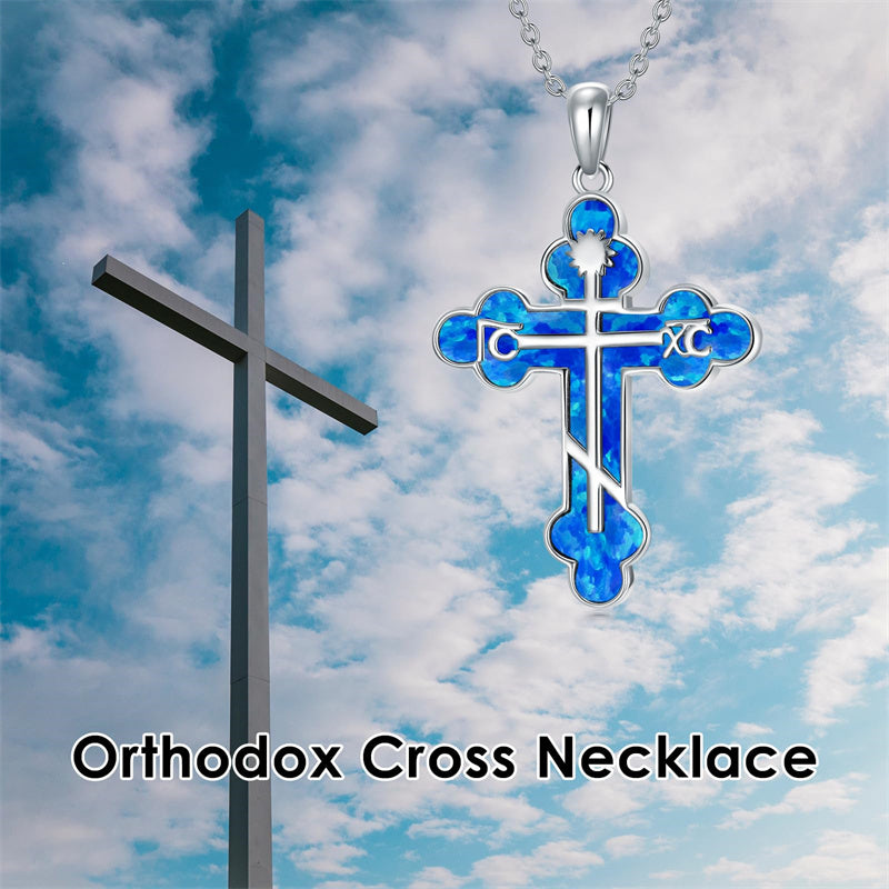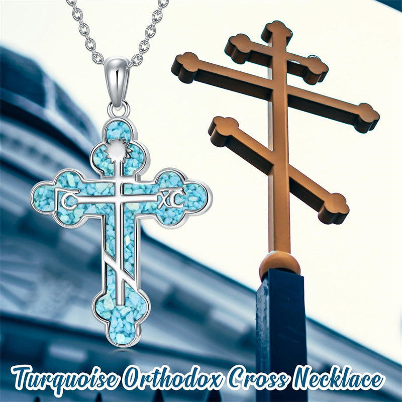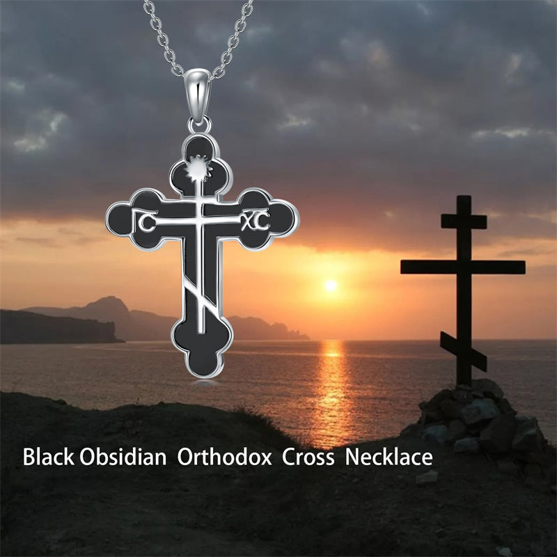 The pendant is a classic Orthodox cross design, typically featuring a cross with three horizontal beams representing the Holy Trinity. The arms of the cross are usually slightly slanted, with the lower beam longer than the others.
