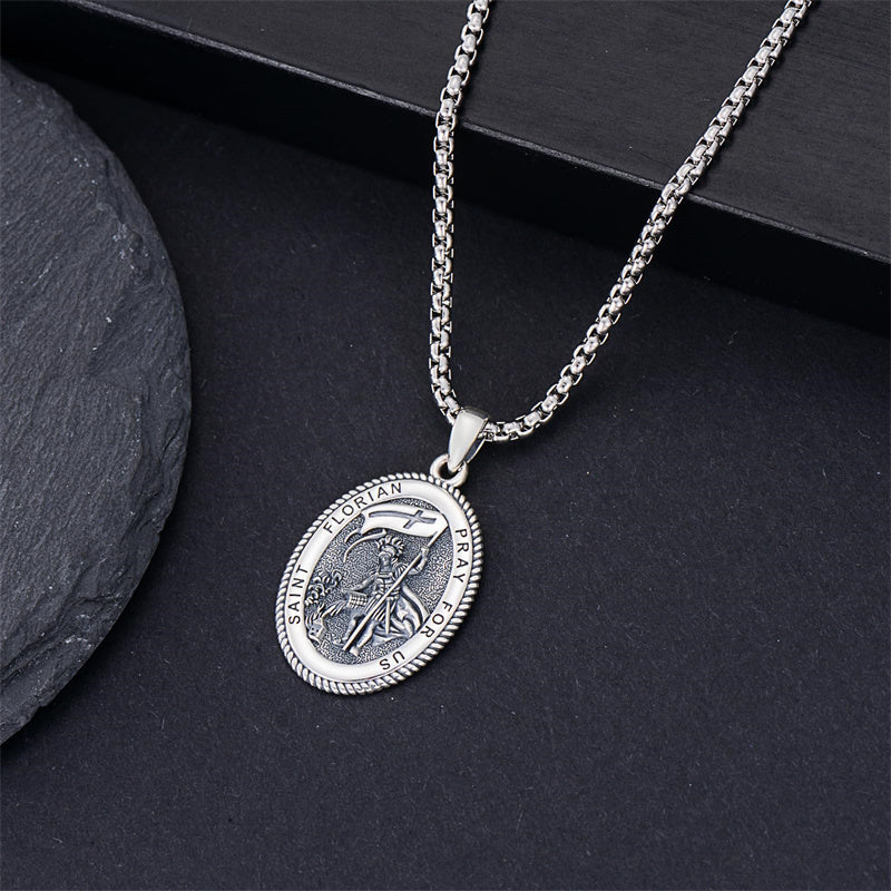【St Florian Medal】Saint Florian is the patron saint of firefighters. Legend has it that St. Florian put out a fire and saved a village from destruction with just a bucket of water. Saint Florian is often depicted in art pouring water from a bucket or small container. You can give this Saint Florian necklace as a talisman to your special someone.