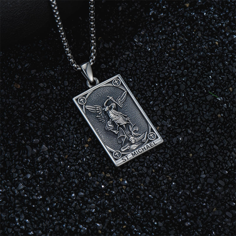 Saint Michael: The St. Michael pendant. It strikingly portrays St Michael the archangel in a victorious stance, flanked by cross motifs, which lends a solemn and potent religious vibe. Wearing this protection amulet pendant necklace lets people feel his sacred guardianship.
