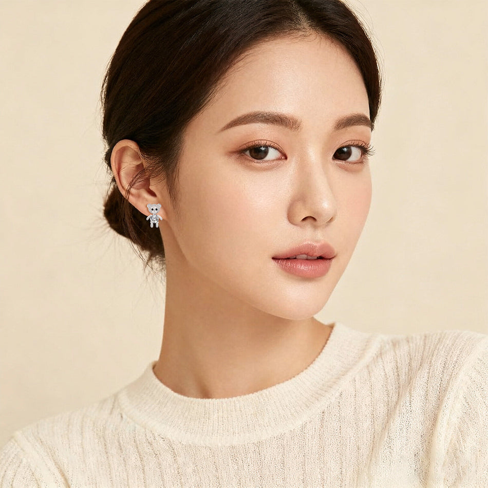 These exquisite silver bear stud earrings feature an intricate design with sparkling Moissanite accents, creating a charming and luxurious accessory. Crafted with precision, each earring showcases a detailed teddy bear shape, complete with round ears, expressive black bead eyes, and a shimmering Moissanite-encrusted belly. The polished silver finish enhances their elegance, while the compact size ensures comfort for daily wear. Set against a soft beige backdrop with a delicate white flower, the earrings exude sophistication and playfulness, making them ideal for special occasions or casual outings. Their unique blend of whimsy and refinement appeals to jewelry lovers seeking a statement piece that combines creativity with quality. Whether gifted or self-purchased, these bear studs promise to become a cherished addition to any collection, adding a touch of joy and style to every ensemble.